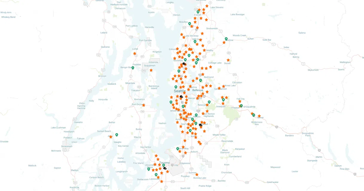 Arlington, Auburn, Bainbridge Island, Bellevue, Bothell, Bremerton, Burien, Coupeville, Edmonds, Enumclaw, Everett, Freedland, Gig Harbor, Issaquah, Kent, Kirkland, Lake Forest Park, Lake Stevens, Lynnwood, Maple Valley, Marysville, Mercer Island, Monroe, Mountlake Terrace, Mukilteo, Newcastle, Normandy Park, Port Orchard, Puyallup, Redmond, Renton, Sammamish, Seattle, SeaTac, Shoreline, Snohomish, Tacoma, Tukwila, University Place, Woodinville.